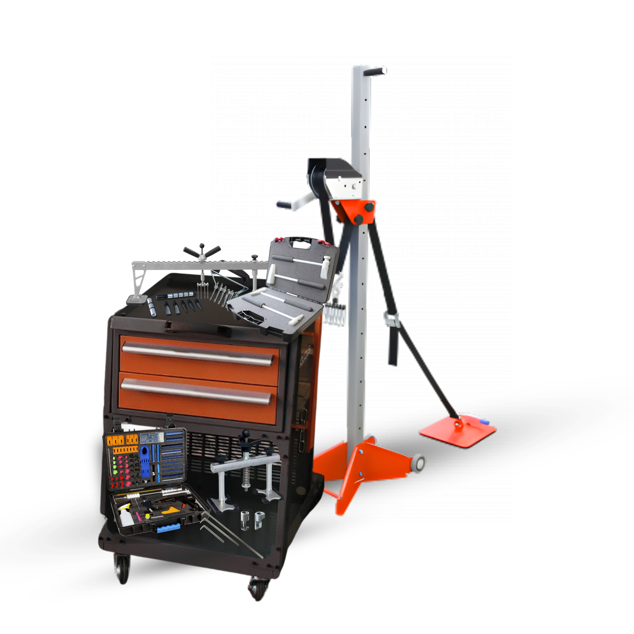 Uses plastic tabs with hot glue to straighten dented areas without damaging the finished surface, includes cart and more.